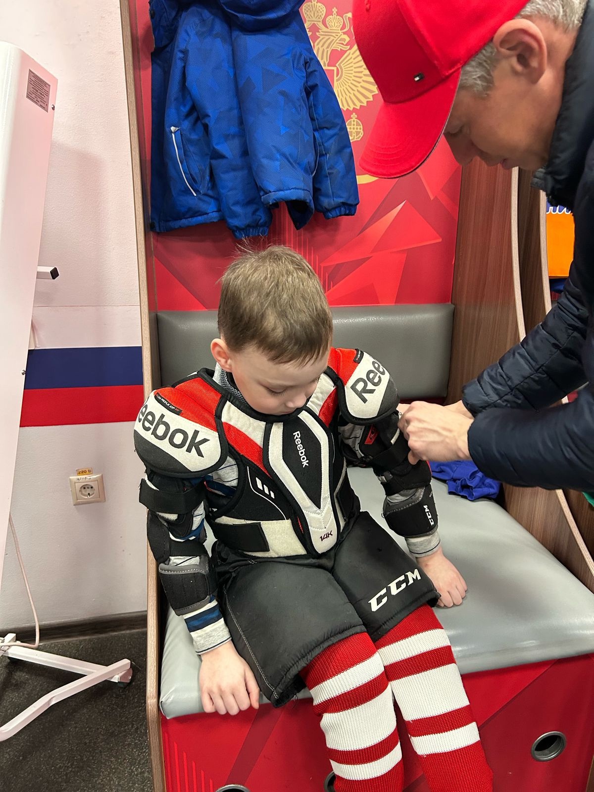 А еще у нас новичок! Максим, ему 6 лет. Подобрали форму. Первый выход на лед! Пусть все получится, будем рады, если Максим полюбит хоккей так же, как и мы!