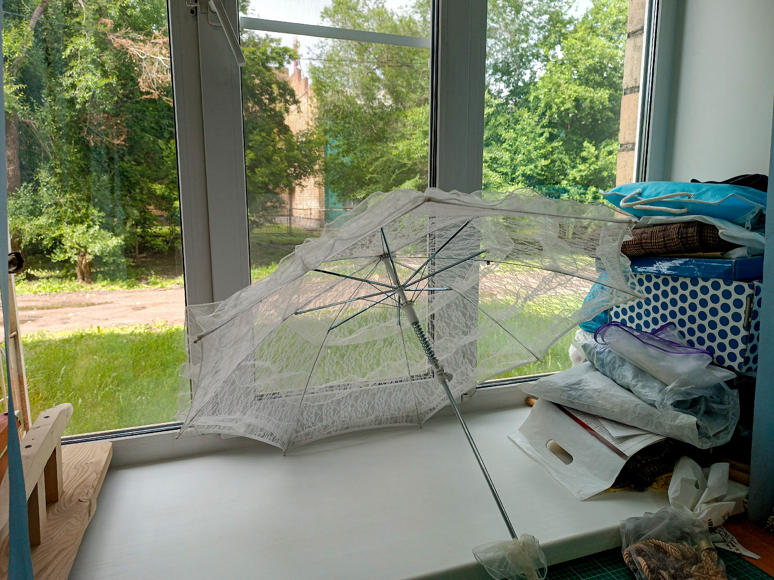 Зонтик скучает в тени, манекены ждут дней подготовки к спектаклю.