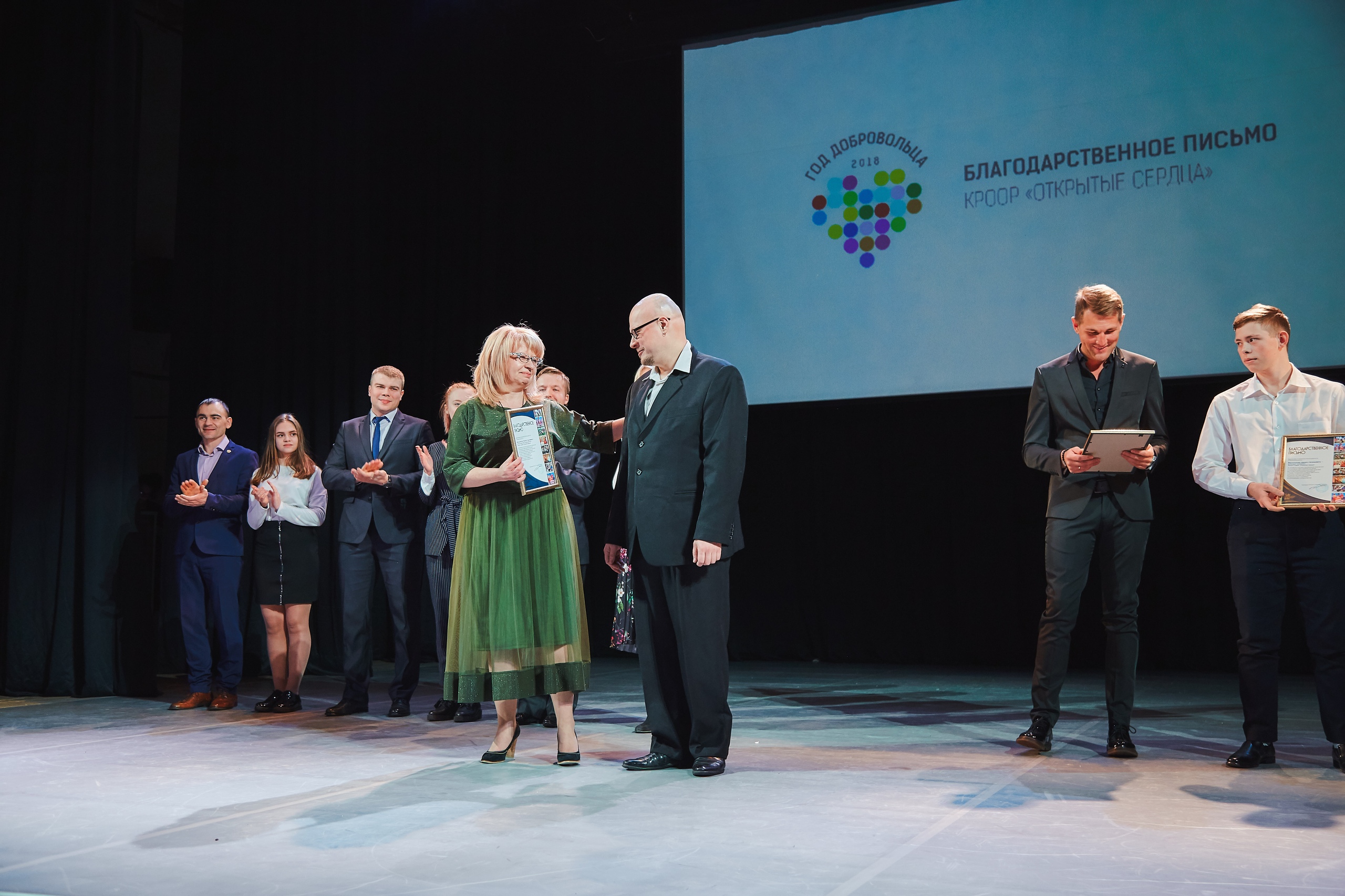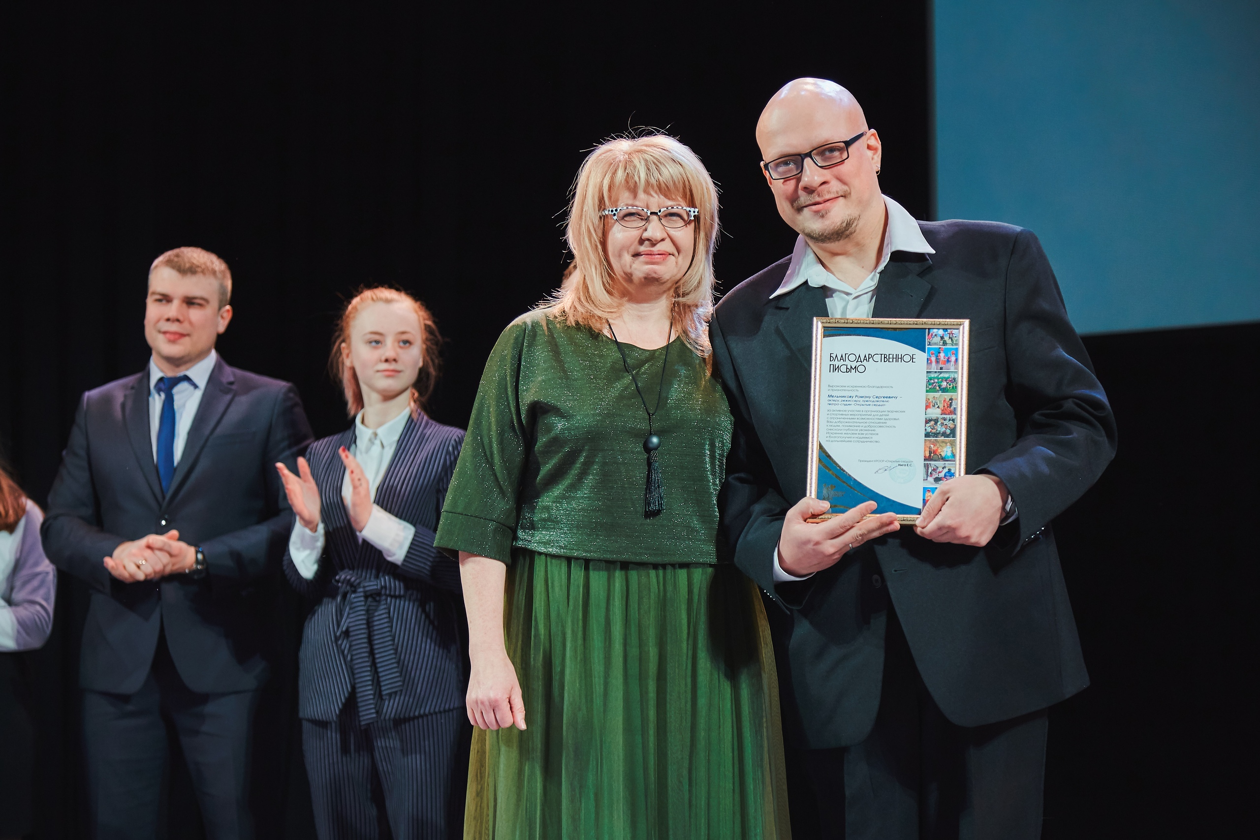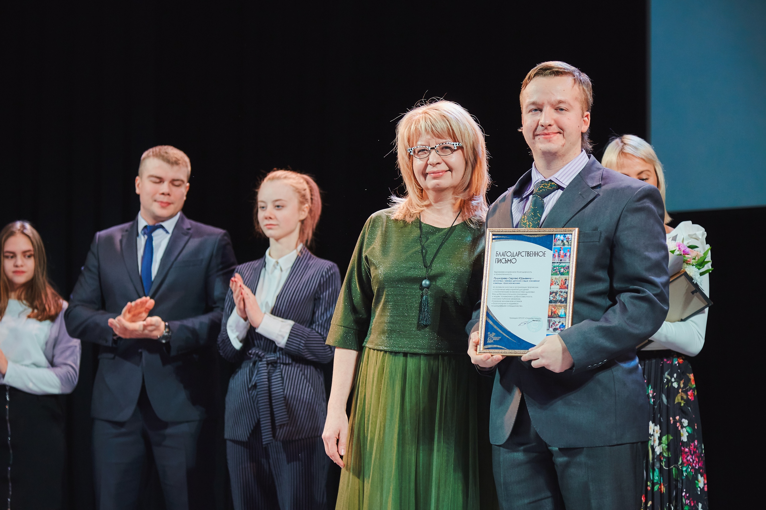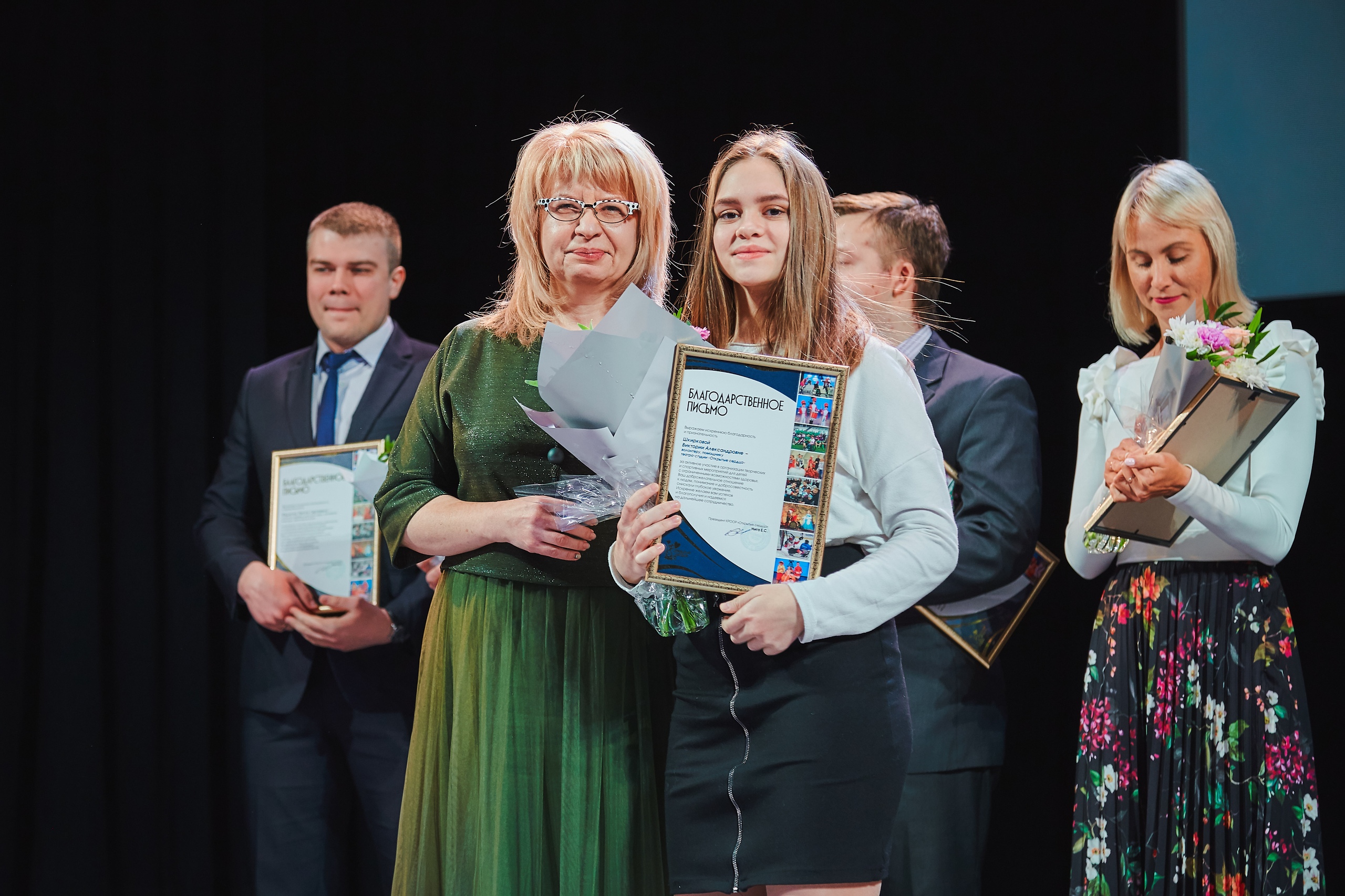 Благодарственные письма от Красноярской региональной общественной организации родителей по защите прав детей с ограниченными возможностями "Открытые сердца" на Церемонии награждения были вручены участникам и добровольцам театр-студии "Открытые сердца", тренерскому составу Детской следж-хоккейной команды"Красная молния", театр-танца "Freedom", команды КВН "Люди ИКС"