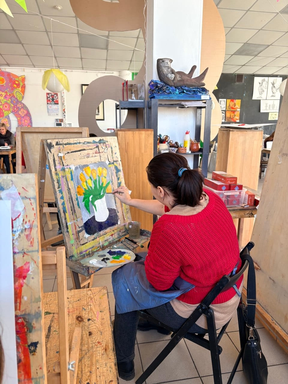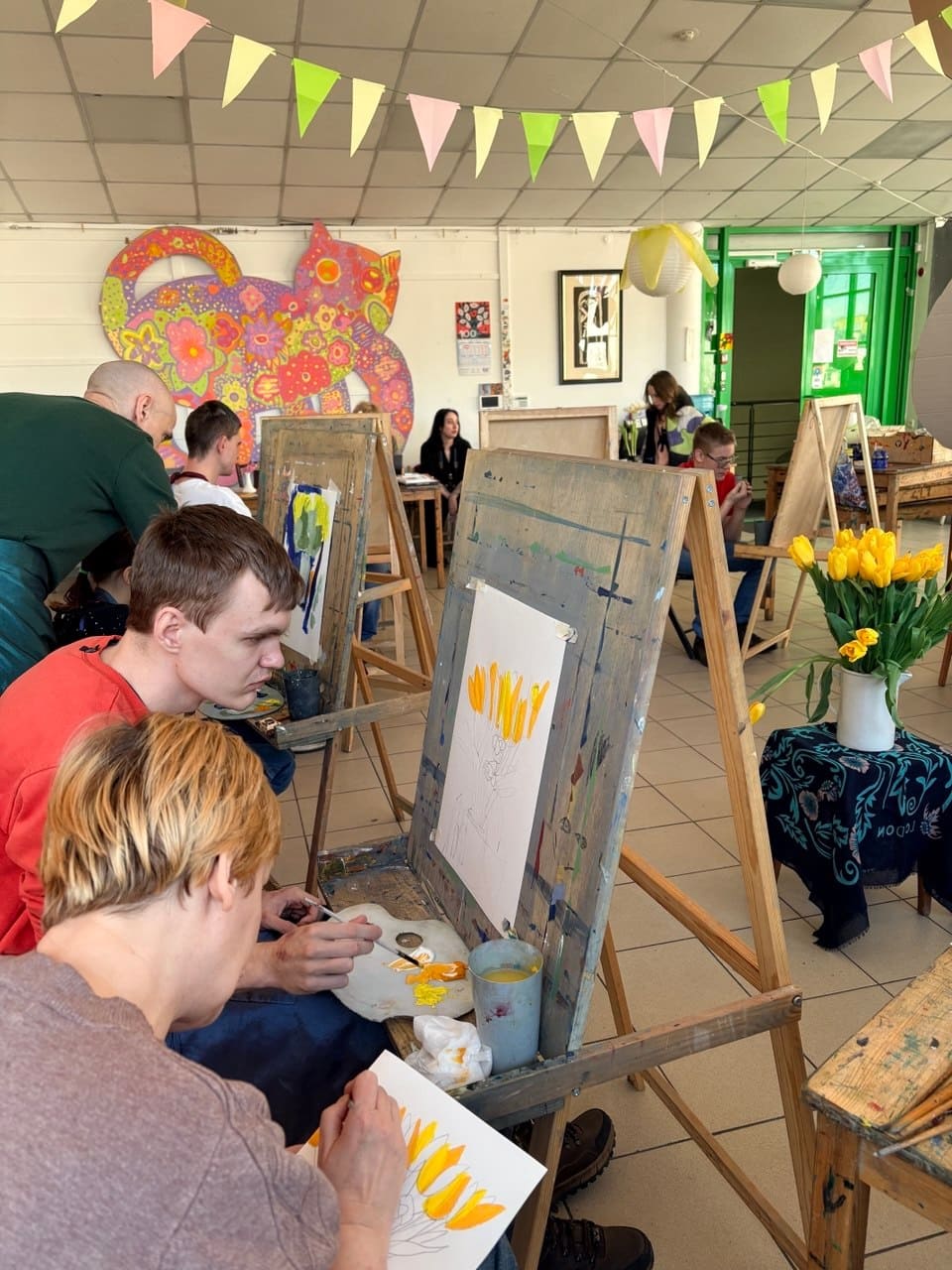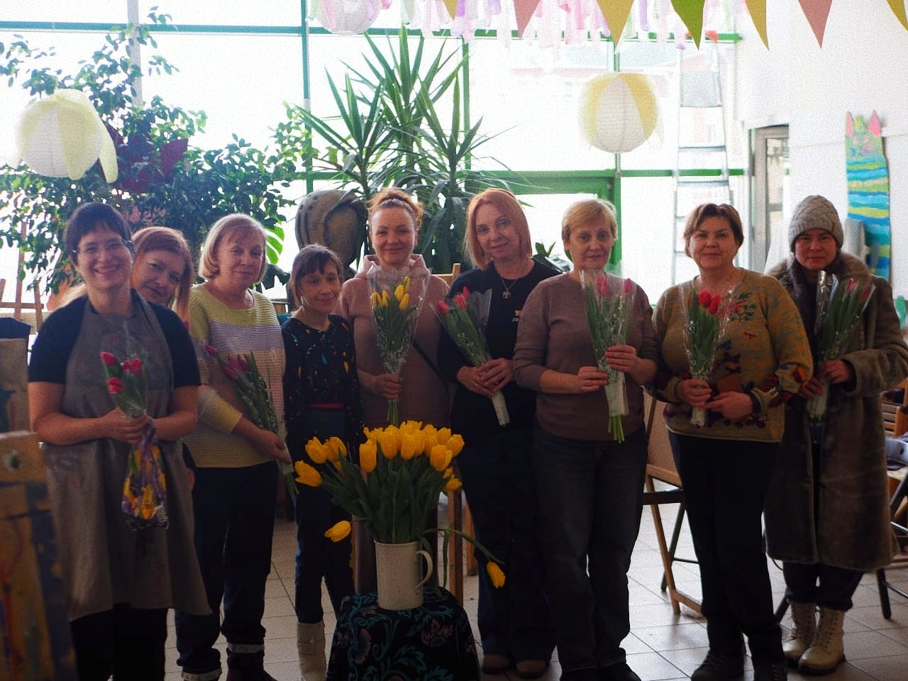 Когда за окном еще лежит снег, в мастерской расцветают букеты тюльпанов.