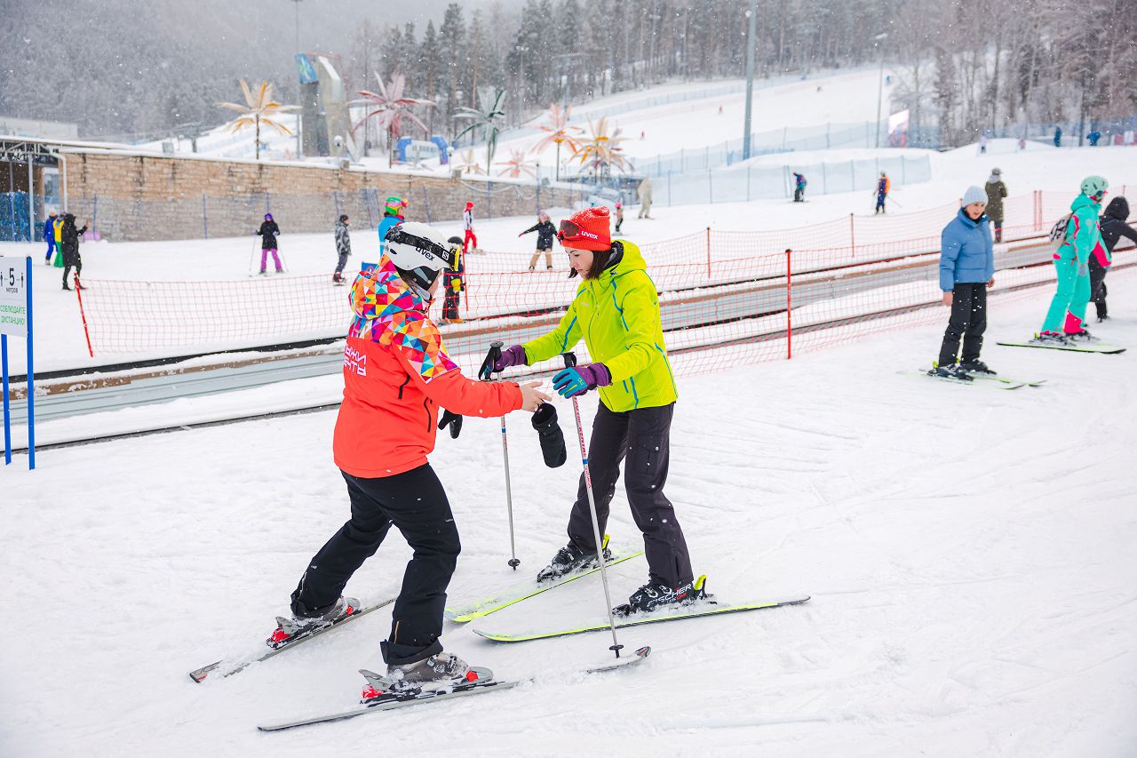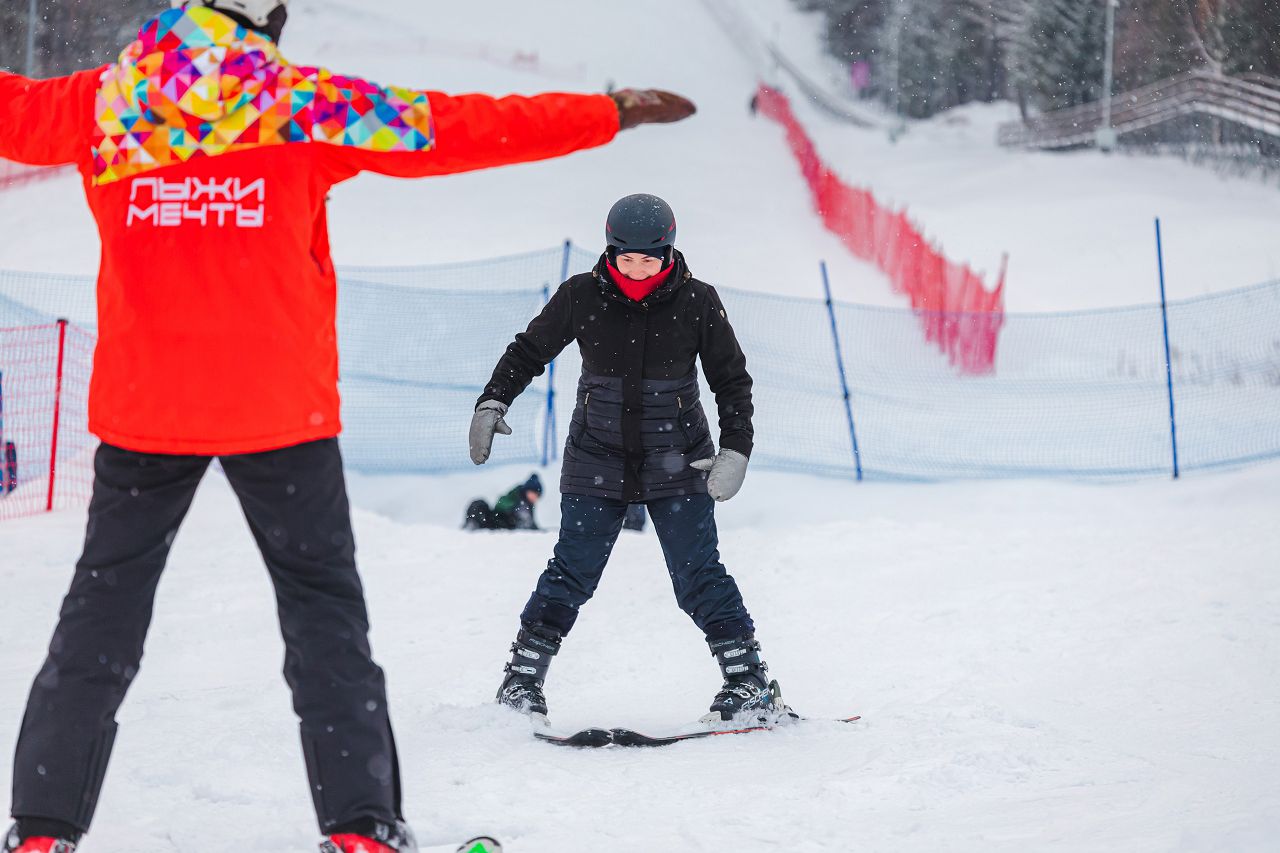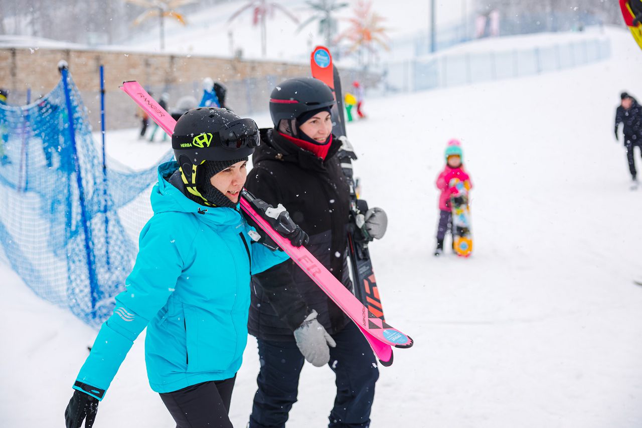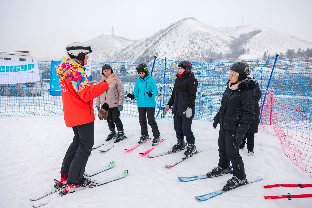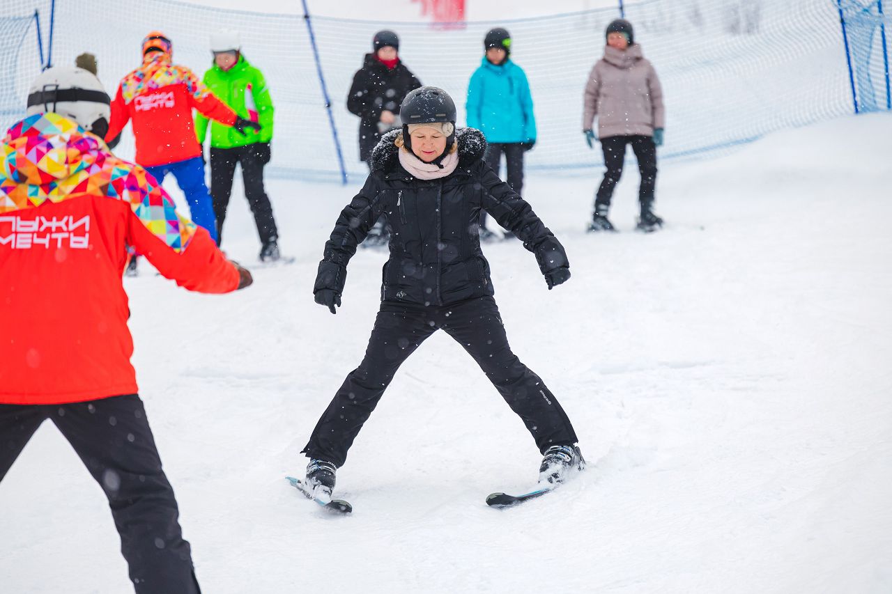 После подбора оборудования и экипировки наши смелые мамы вышли на учебный склон, где инструкторы провели для разминку, инструктаж по безопасности и поделились лайфхаками, как преодолеть первые трудности: как тормозить, как контролировать скорость, как вообще управлять лыжами, когда на ногах огромные ботинки