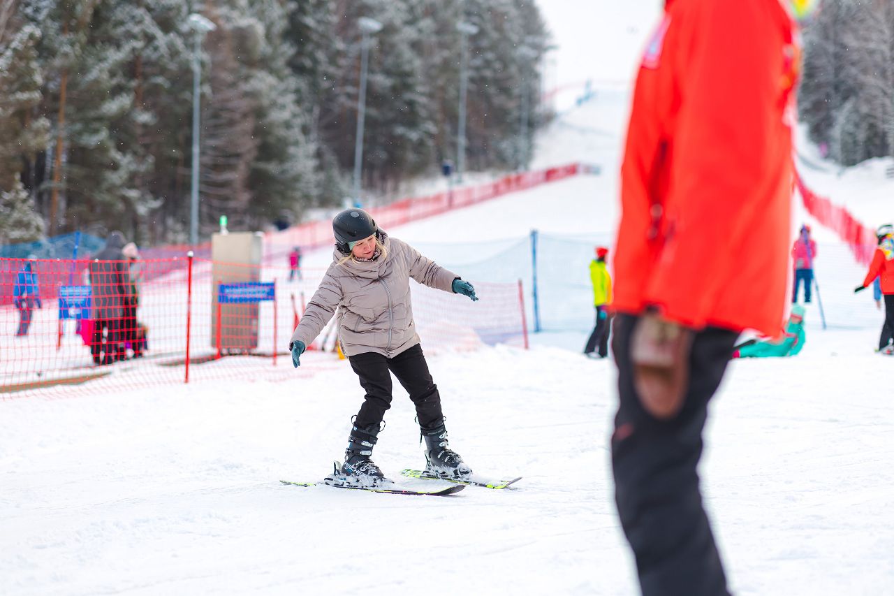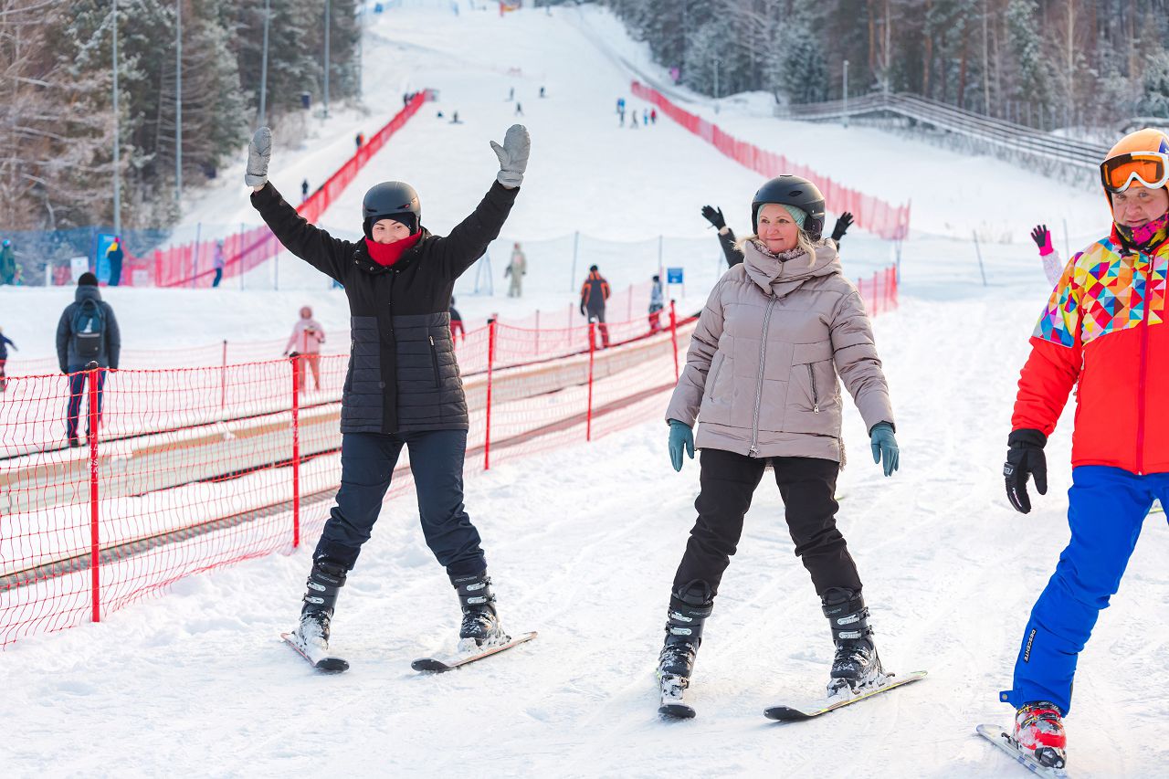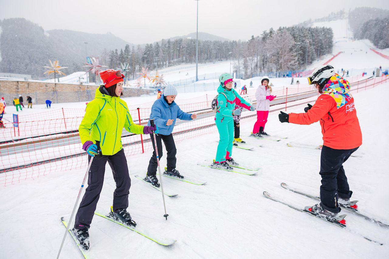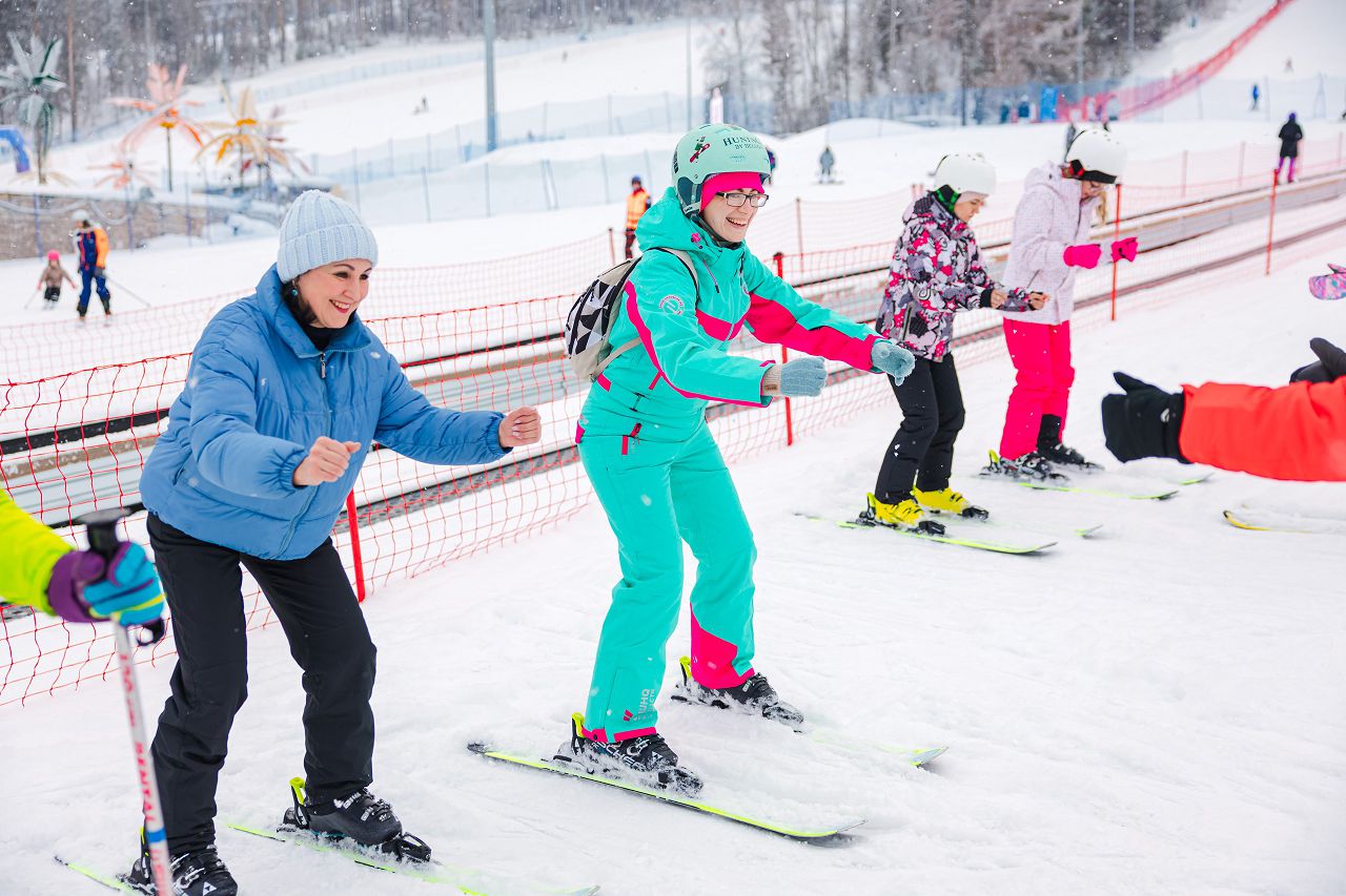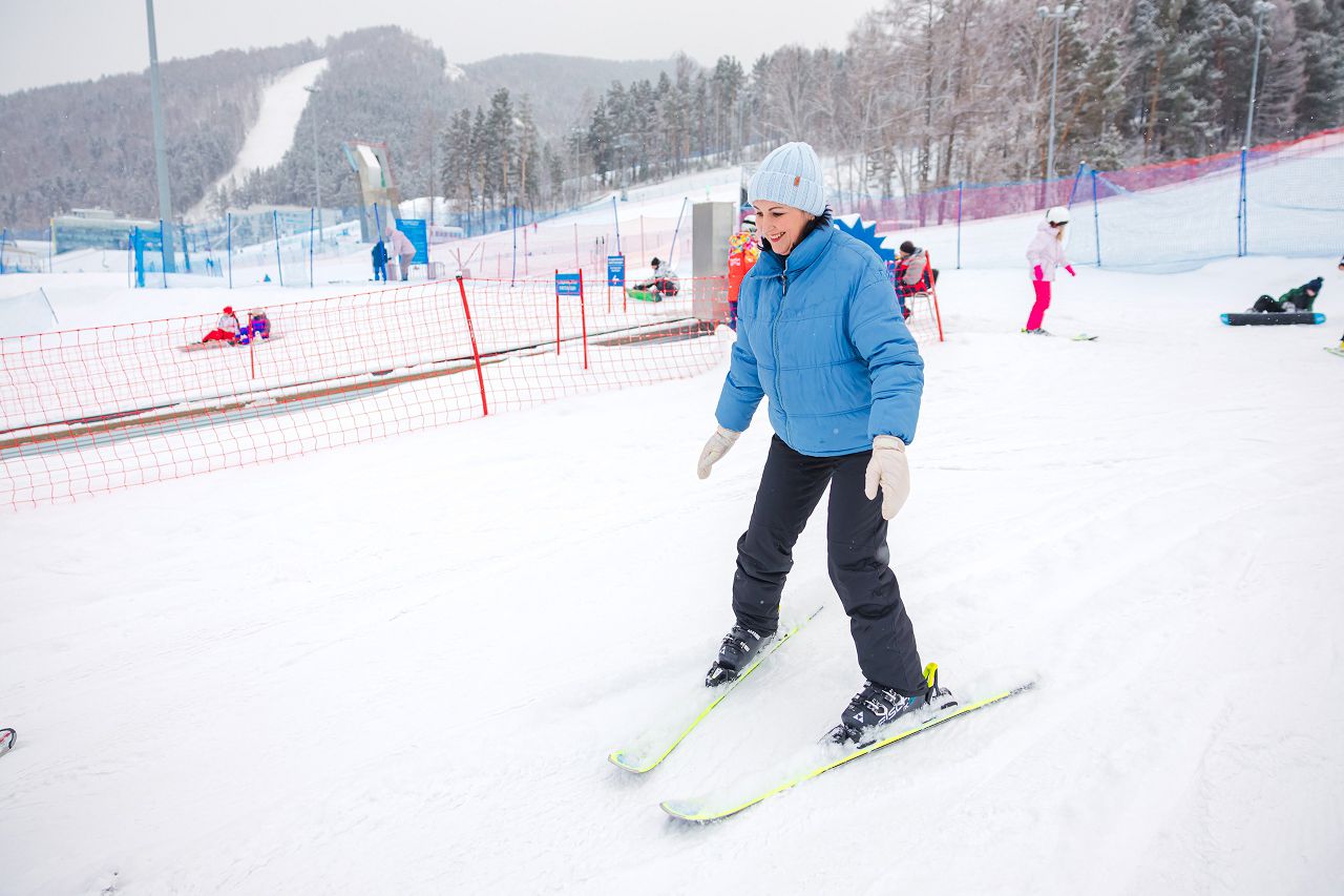 После подбора оборудования и экипировки наши смелые мамы вышли на учебный склон, где инструкторы провели для разминку, инструктаж по безопасности и поделились лайфхаками, как преодолеть первые трудности: как тормозить, как контролировать скорость, как вообще управлять лыжами, когда на ногах огромные ботинки