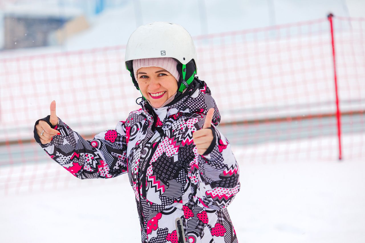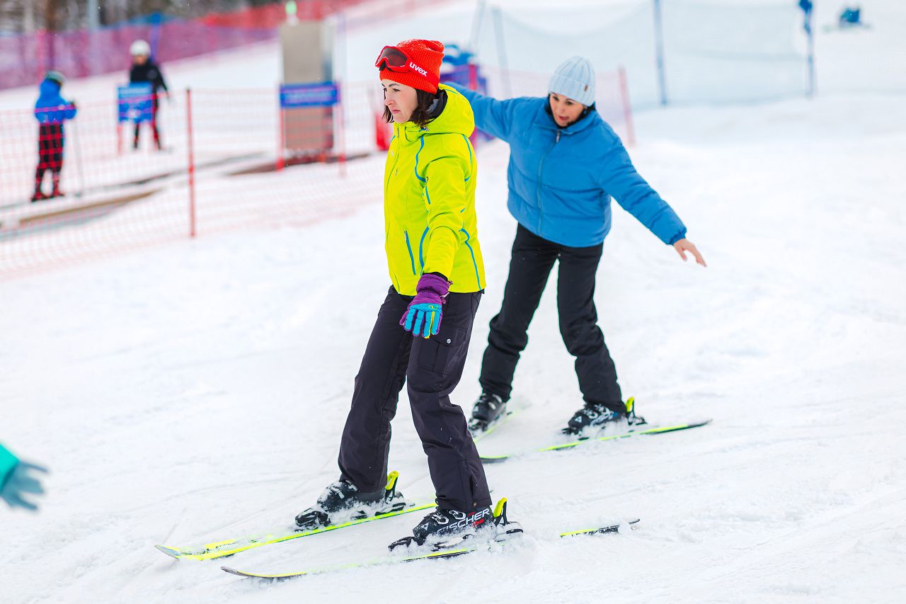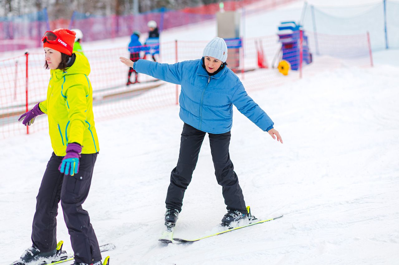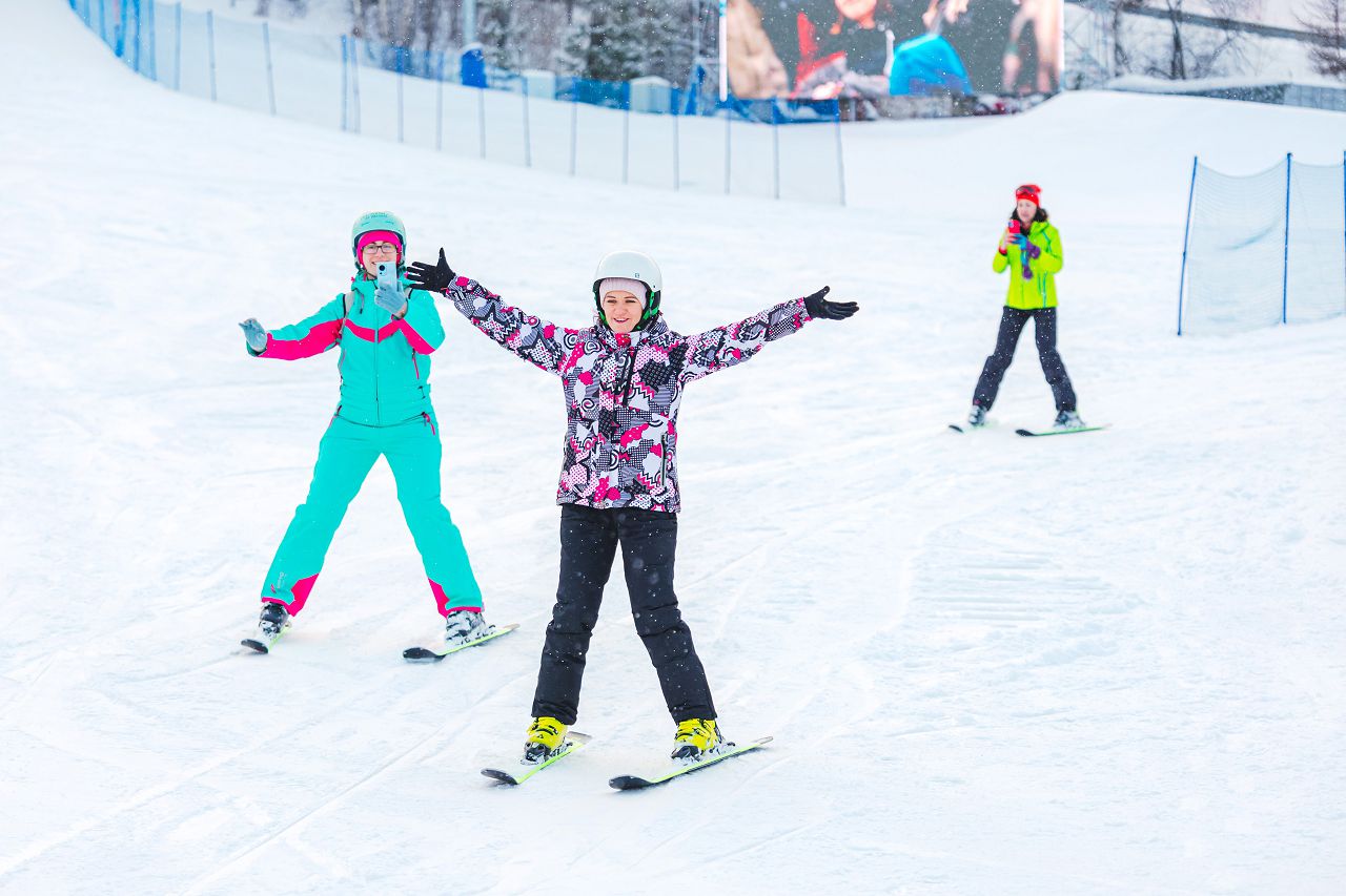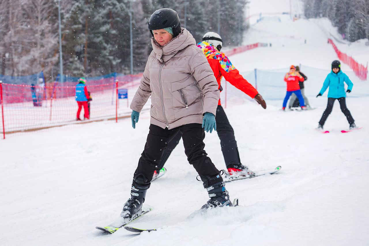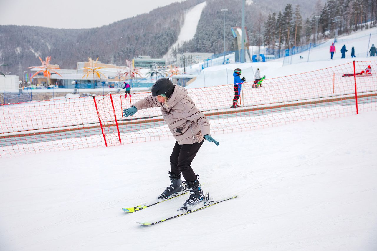 После подбора оборудования и экипировки наши смелые мамы вышли на учебный склон, где инструкторы провели для разминку, инструктаж по безопасности и поделились лайфхаками, как преодолеть первые трудности: как тормозить, как контролировать скорость, как вообще управлять лыжами, когда на ногах огромные ботинки