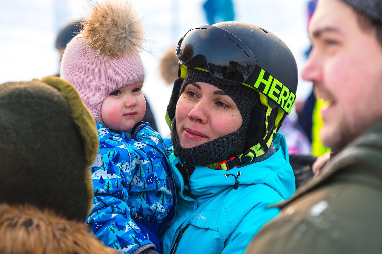 А у подножия трассы – группа поддержки из пап и детей, которые не усидели дома и приехали поддержать наших смелых участниц! В финале все построились и поехали вместе вниз, да так красиво и здорово, что и не поверишь, что участники только встали на лыжи!