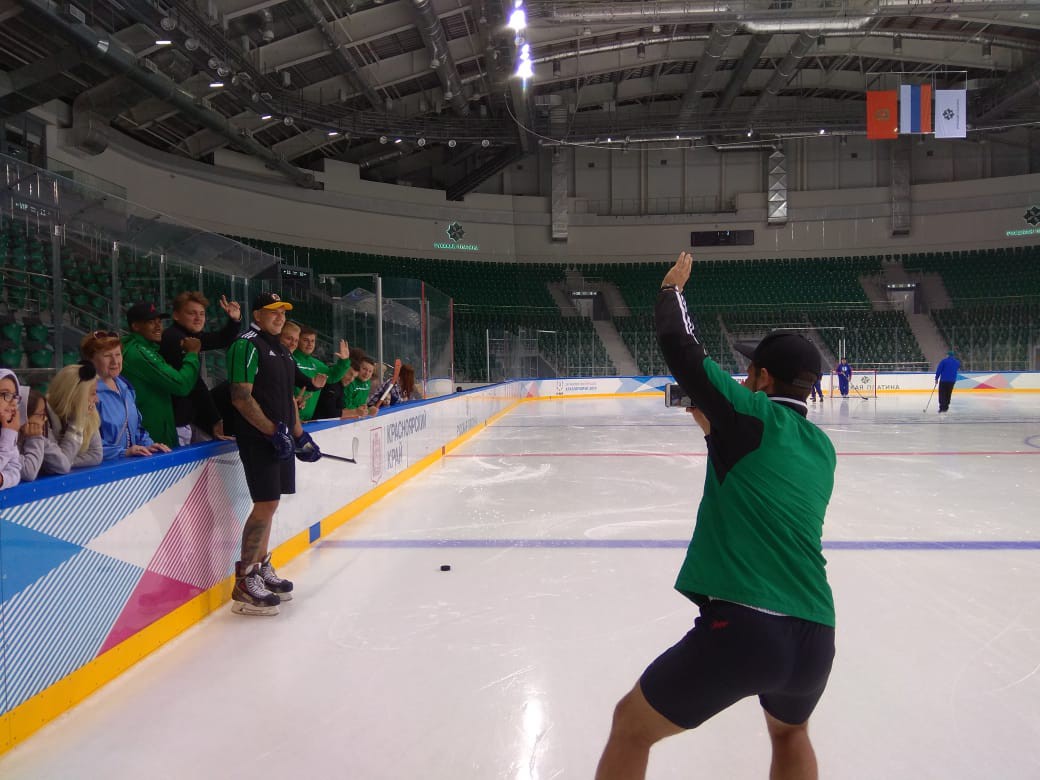 11 августа в День физкультурника на «Платинум Арене» прошла необычная тренировка. На лёд вместе с игроками «Красной молнии» вышли друзья наших хоккеистов – регбисты «Красного Яра». Парни обещали нанести ответный визит и свое обещание – выполнили. Регбисты пришли вместе со своими семьями. Вооружившись клюшками, наши друзья пошли оттачивать мастерство броска шайбы в ворота. В кроссовках по льду парни передвигались неуклюже, но весело!