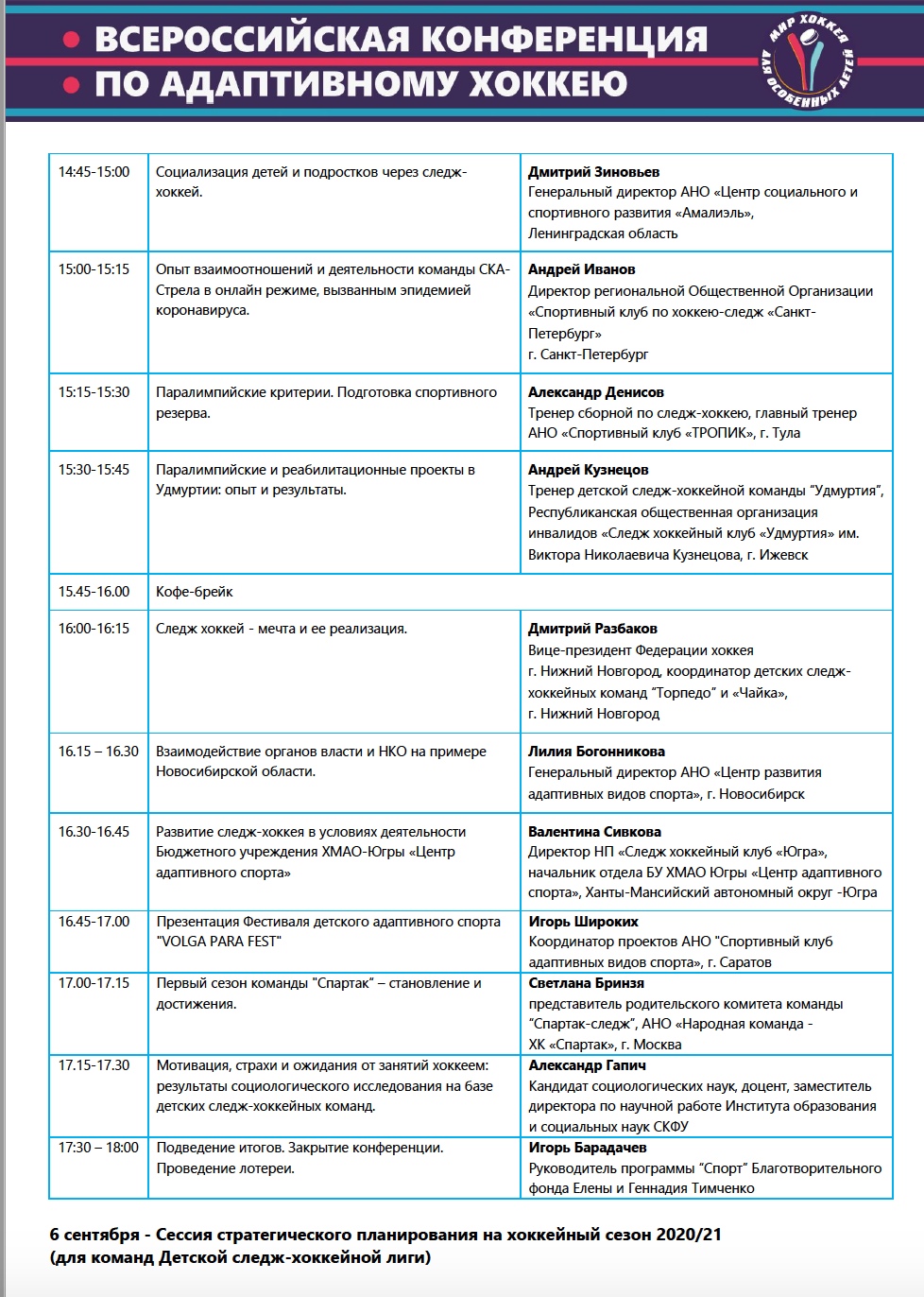 В рамках первого дня, 5 сентября, будет представлен опыт и успешные практики регионов, реализующих проекты по созданию детских хоккейных команд для детей с различными формами инвалидности (хоккей на санях для людей с поражением опорно-двигательного аппарата, специальный хоккей для людей с особенностями развития, хоккей для незрячих и слабовидящих).