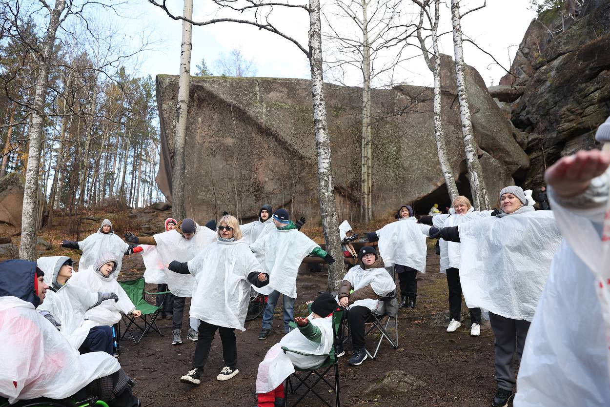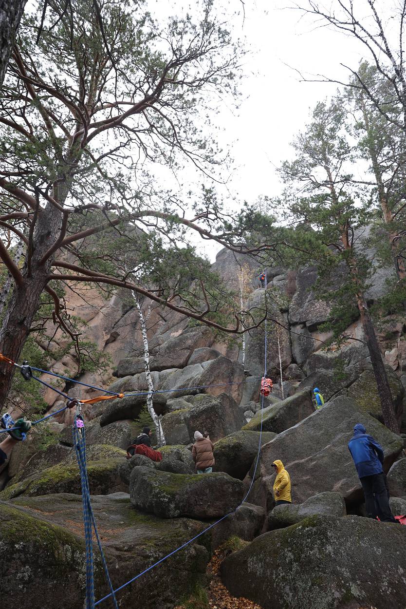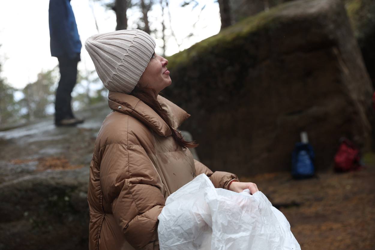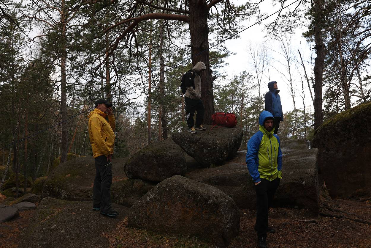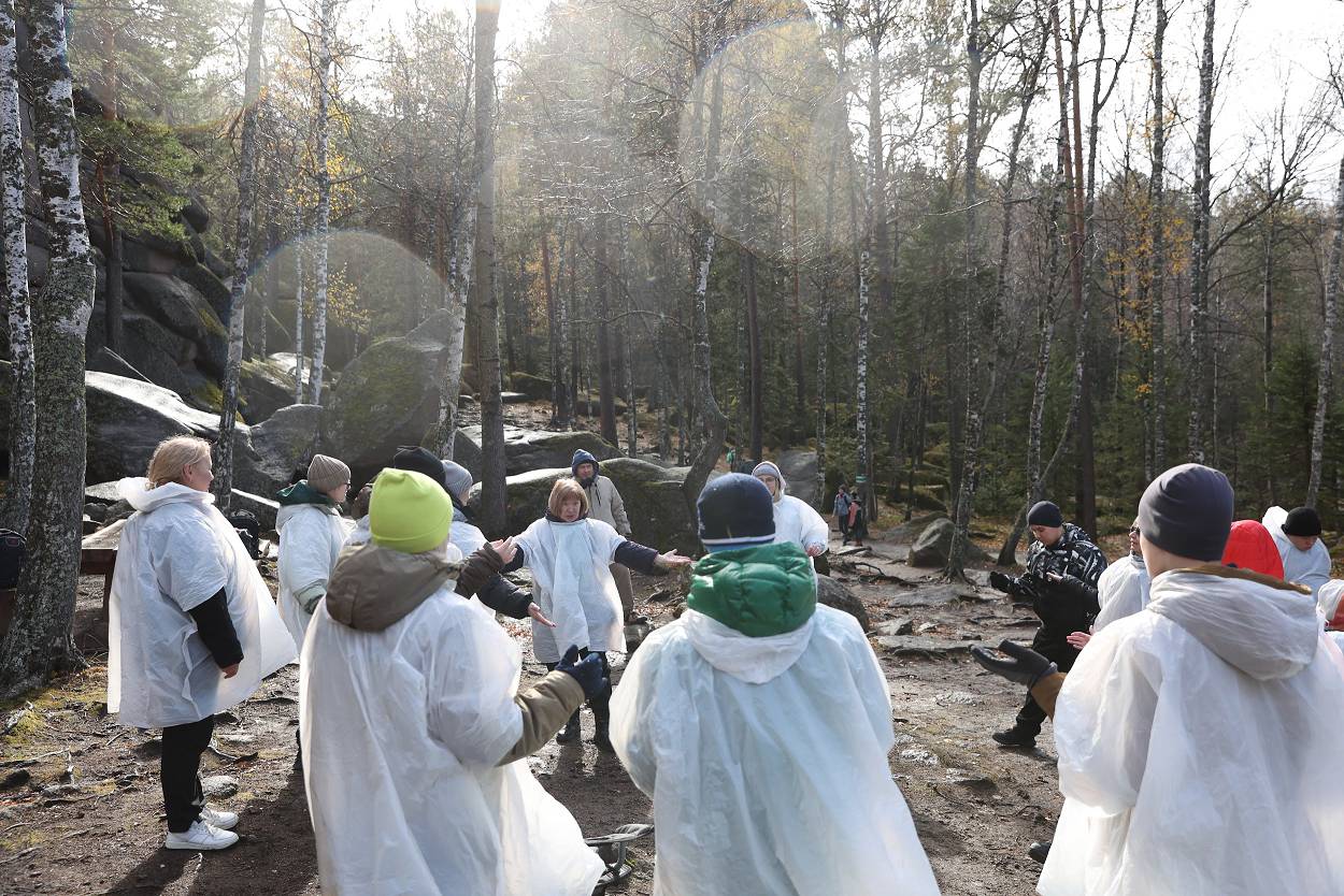 За время пребывания у скалы мы не только играли, узнавали о проектах, но и смогли еще познакомиться с разнообразием «климатических природных проявлений» – от прохлады осеннего утра, со слегка проглядывающим солнышком до резко начинающегося дождя, переходящего в снег с ветром, и снова солнышко. Но все участники стоически перенесли проверку на прочность и каждого можно назвать «особым столбистом».