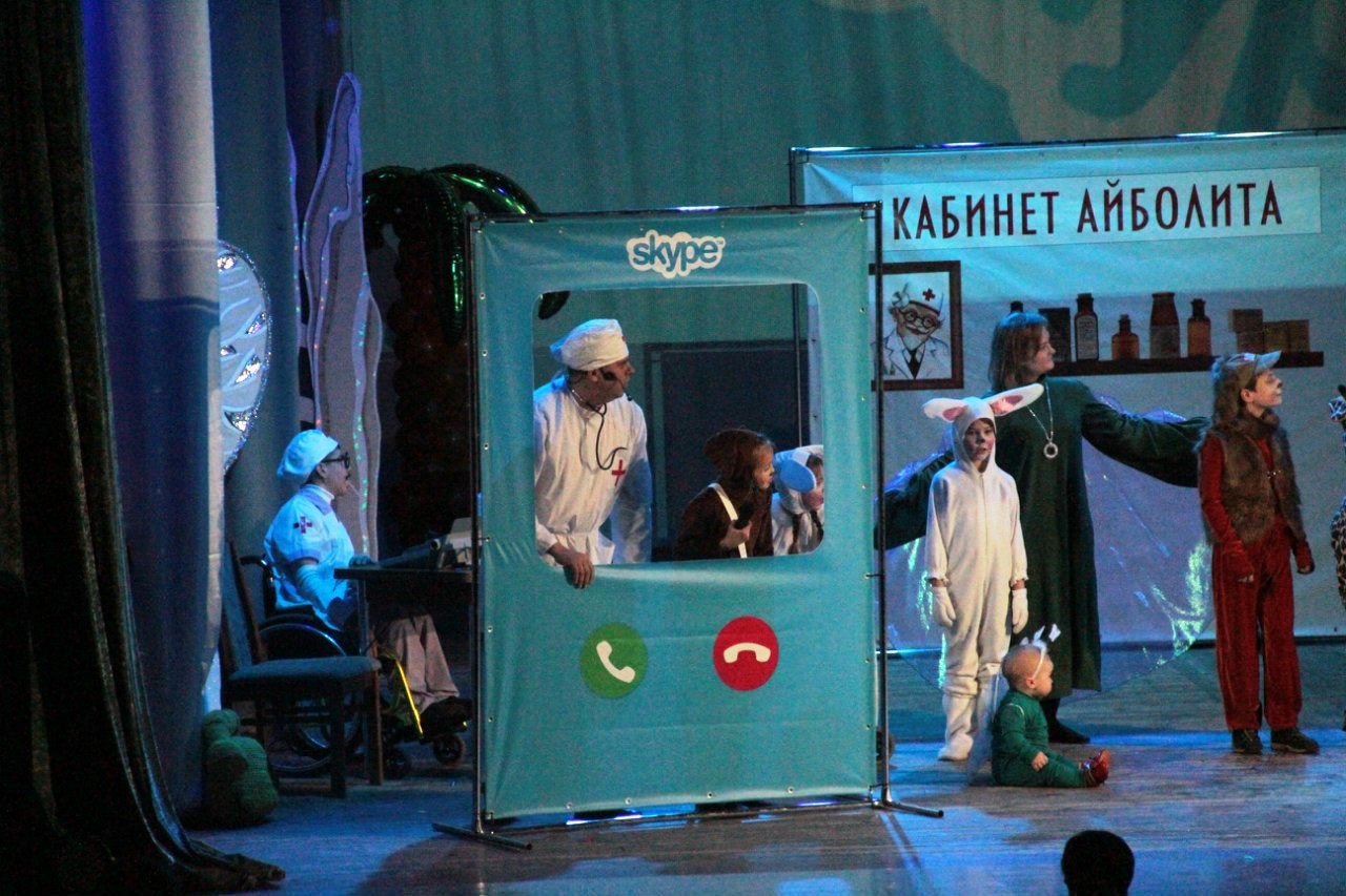 Зрительный зал был разделен на два полюса, на каждом полюсе были для зрителей были приготовлены "северные или южные" шарфики на память и создания причастности к спектаклю. За время представления наши зрители и их родители побывали и на Северном полюсе, и в приемной Айболита, и в знойной Африке!