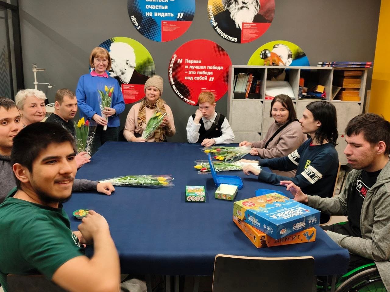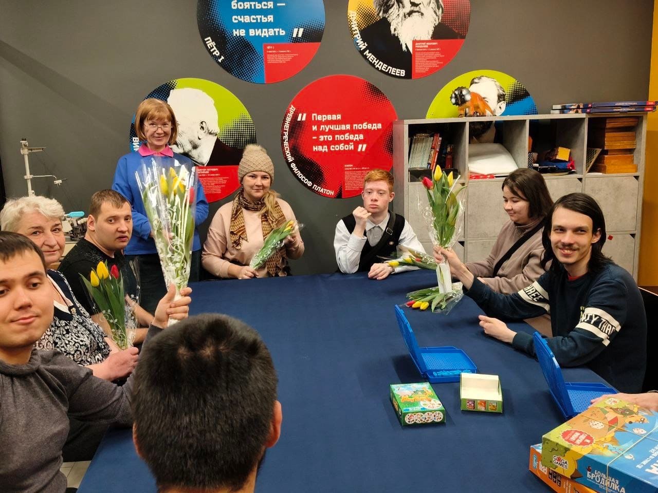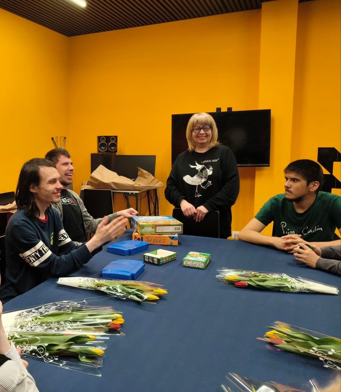А потом мы все вместе играли в «Диксит» и отгадывали ассоциации друг друга, в «Большую бродилку» и даже познакомились с новой игрой «УНО». Было весело, душевно и радостно. А так как не все мамы сегодня смогли к нам присоединиться, то наши мальчишки понесли им букеты домой.