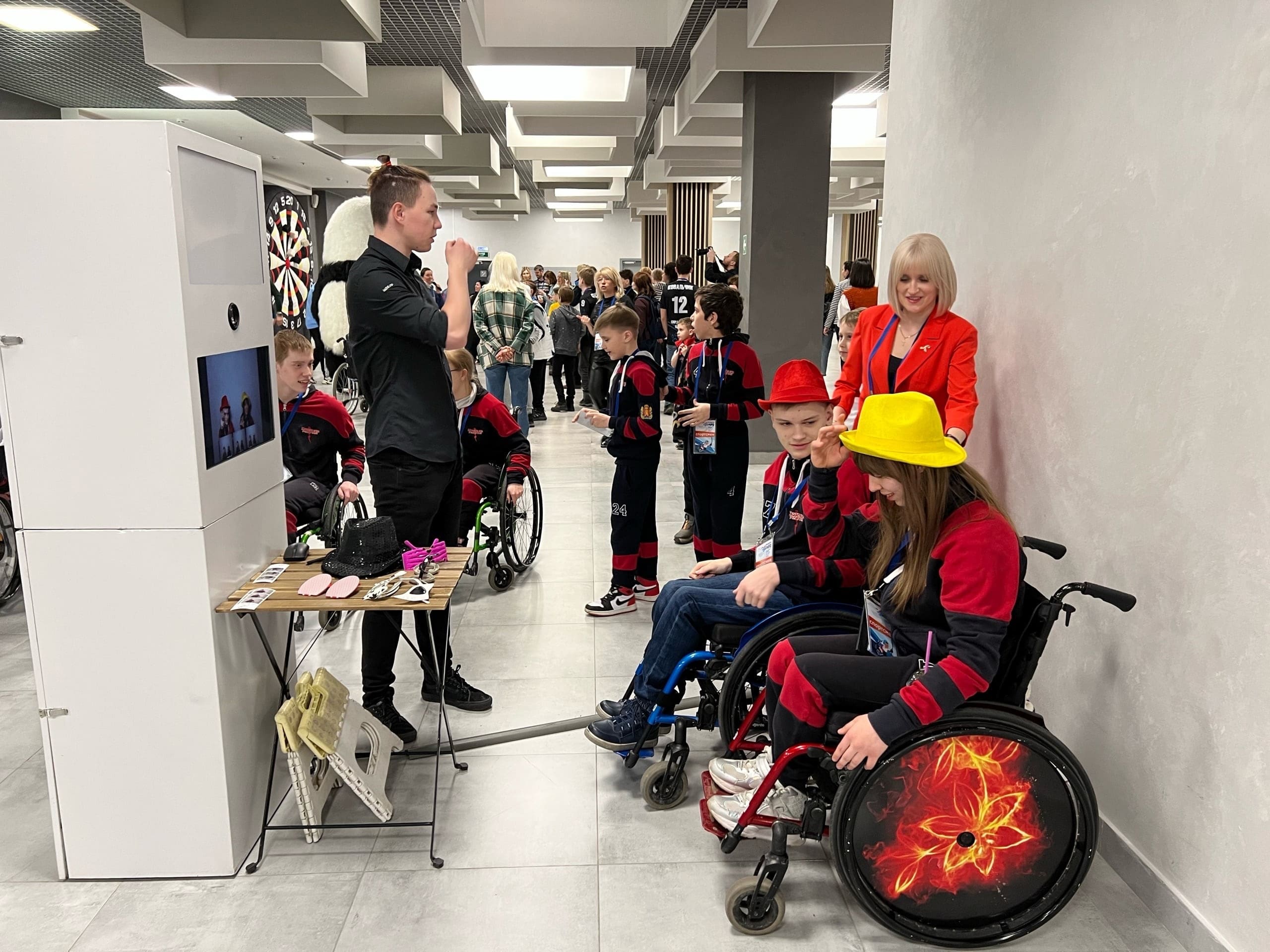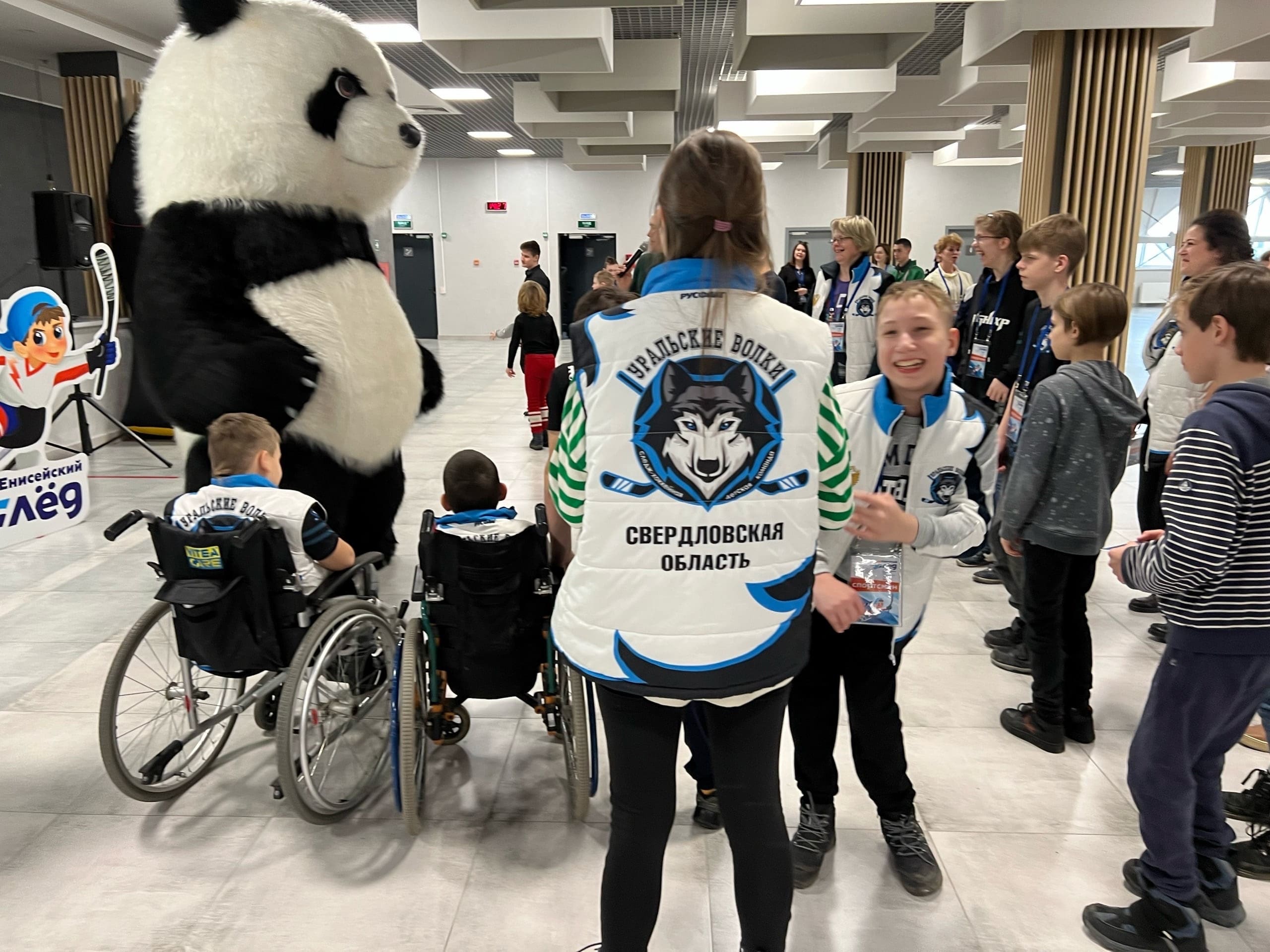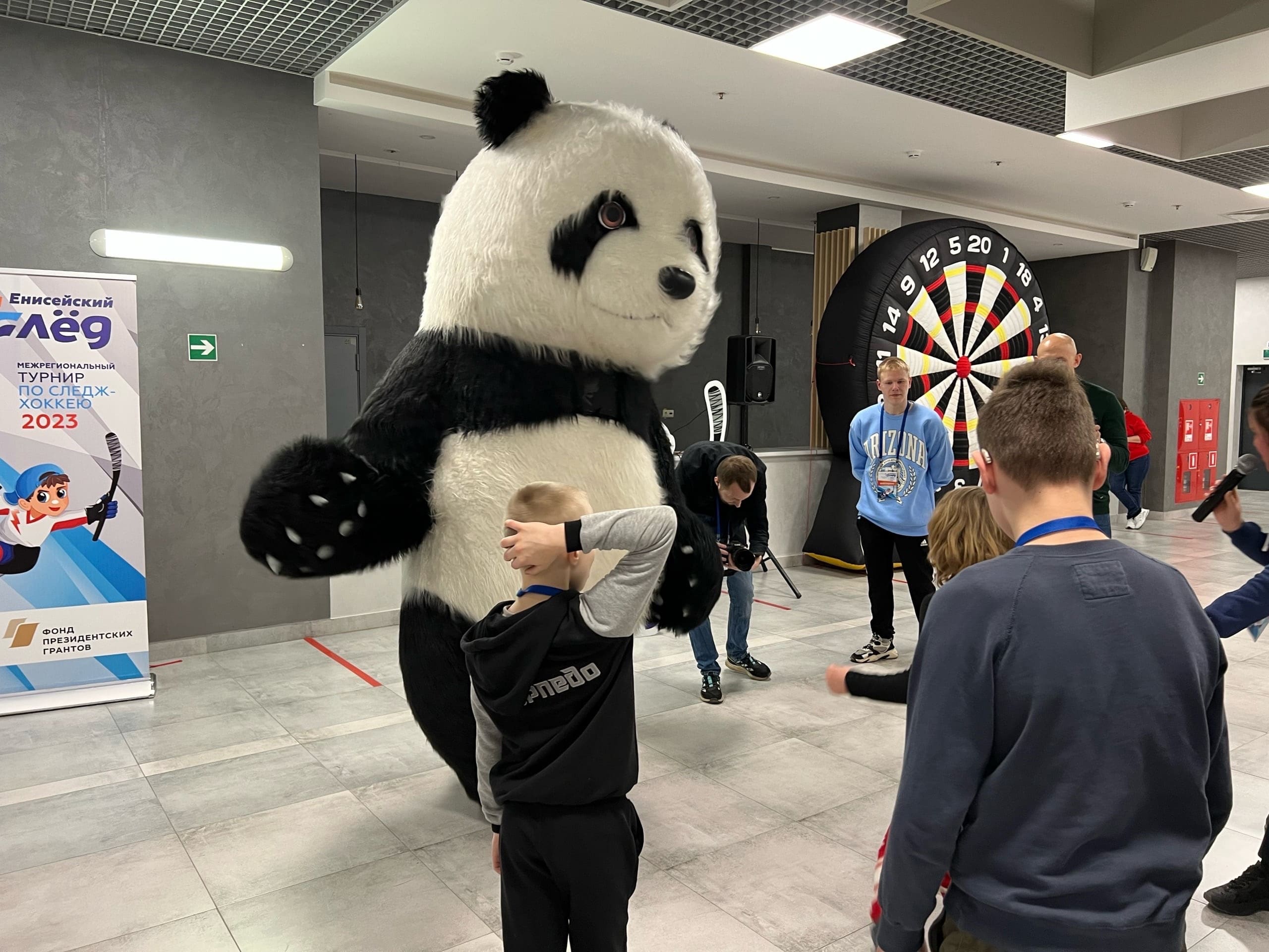 А пока для участников команд проходит небольшое состязание. Организаторы подготовили для хоккеистов интересные локации, где они могут посоревноваться в меткости, потанцевать с весёлой пандой и пофотографироваться в специальной фотобудке.