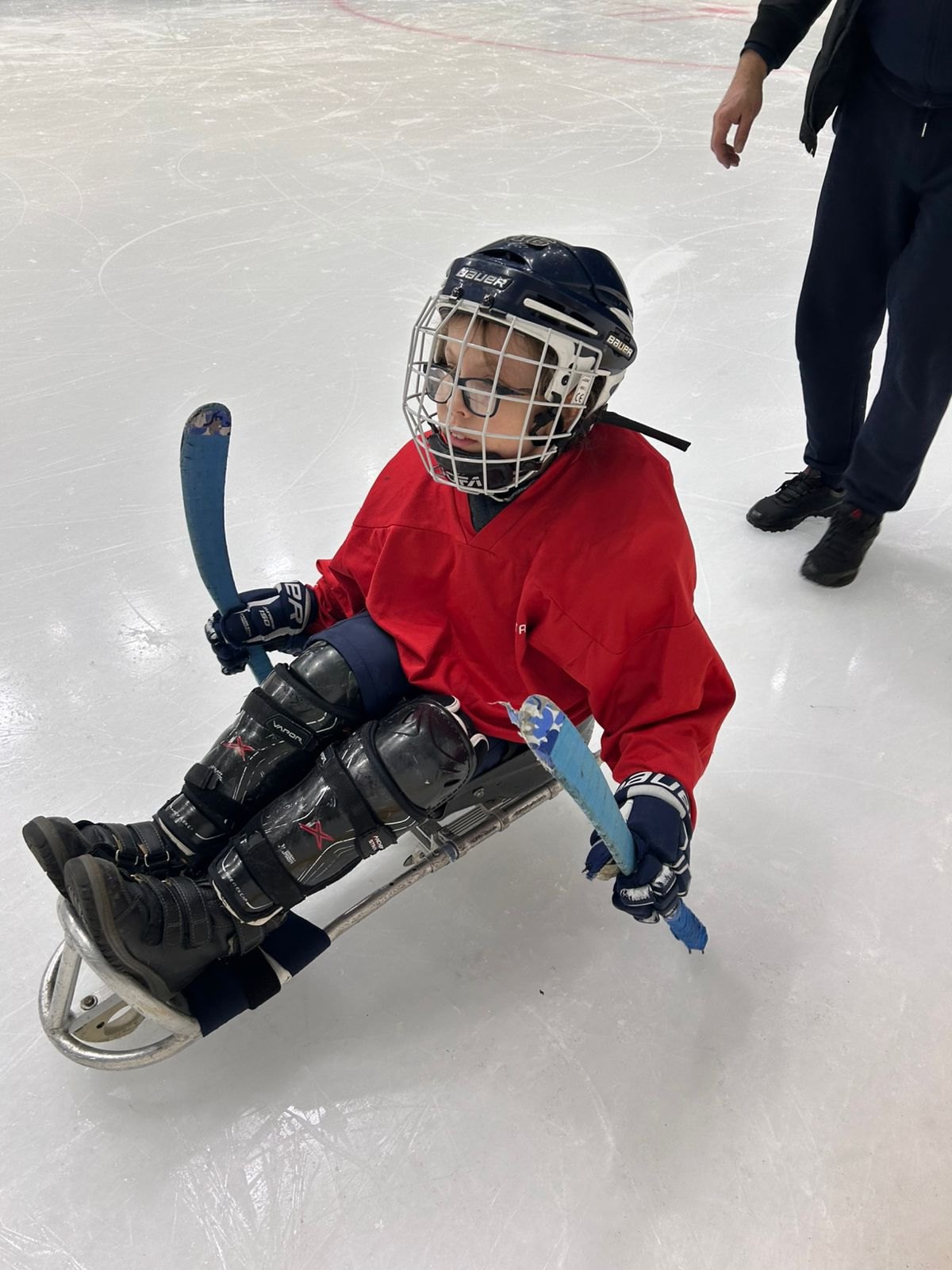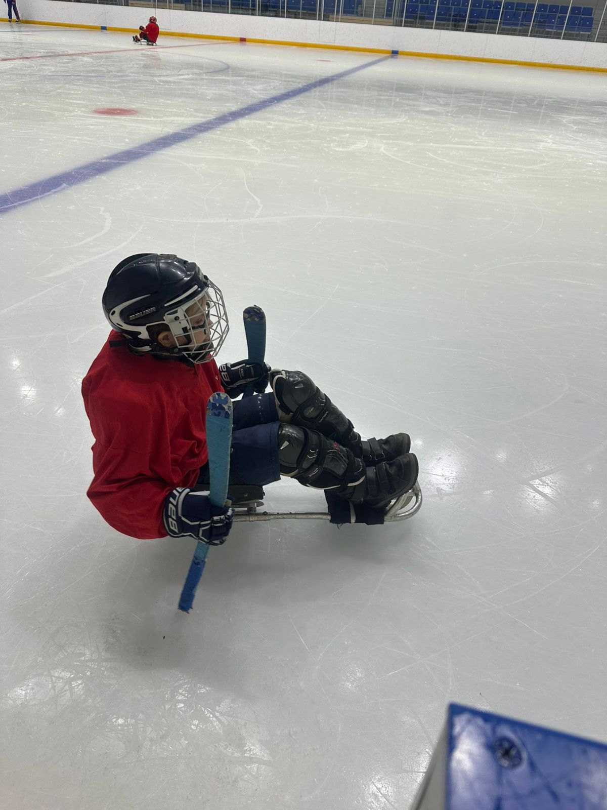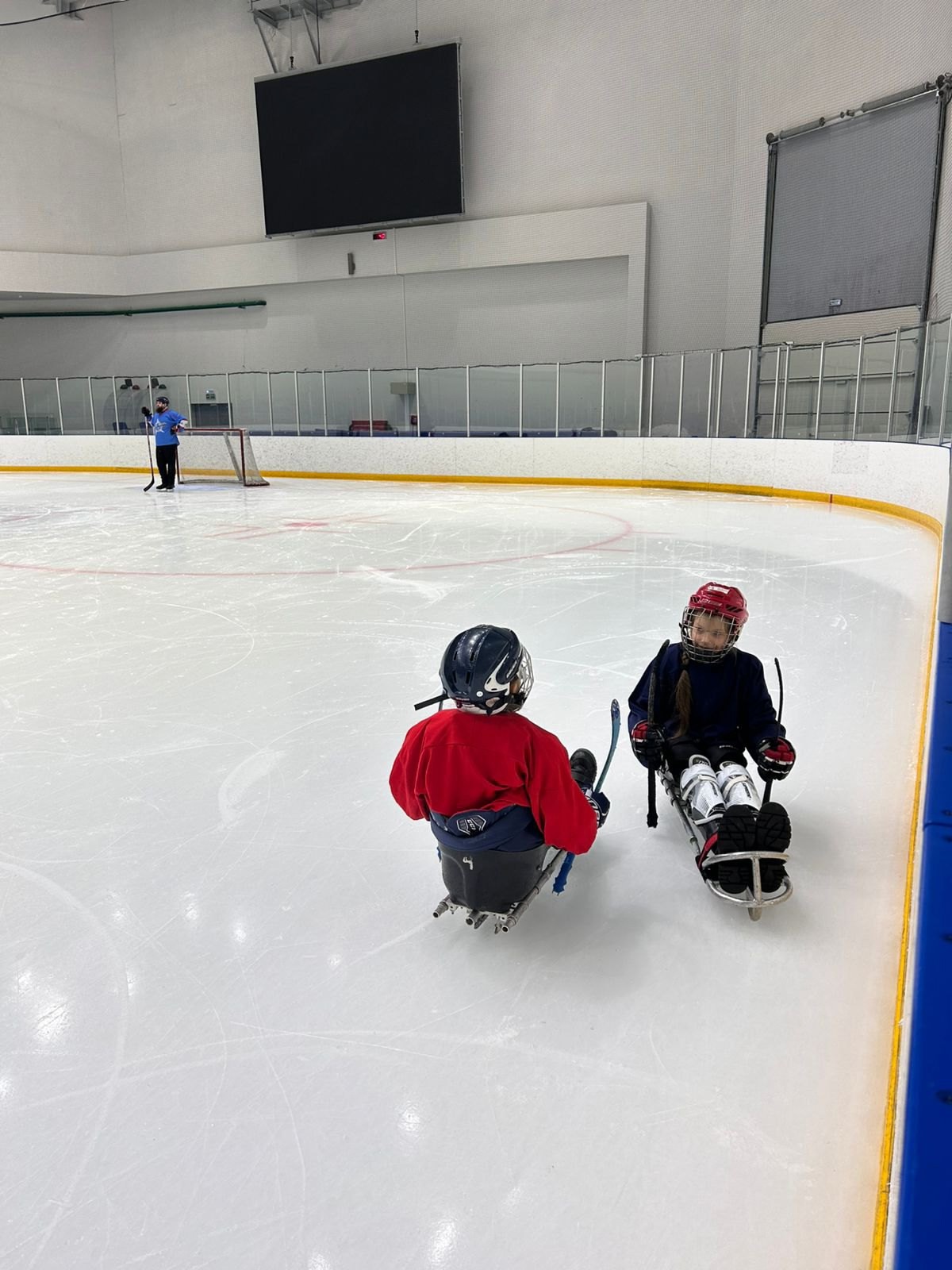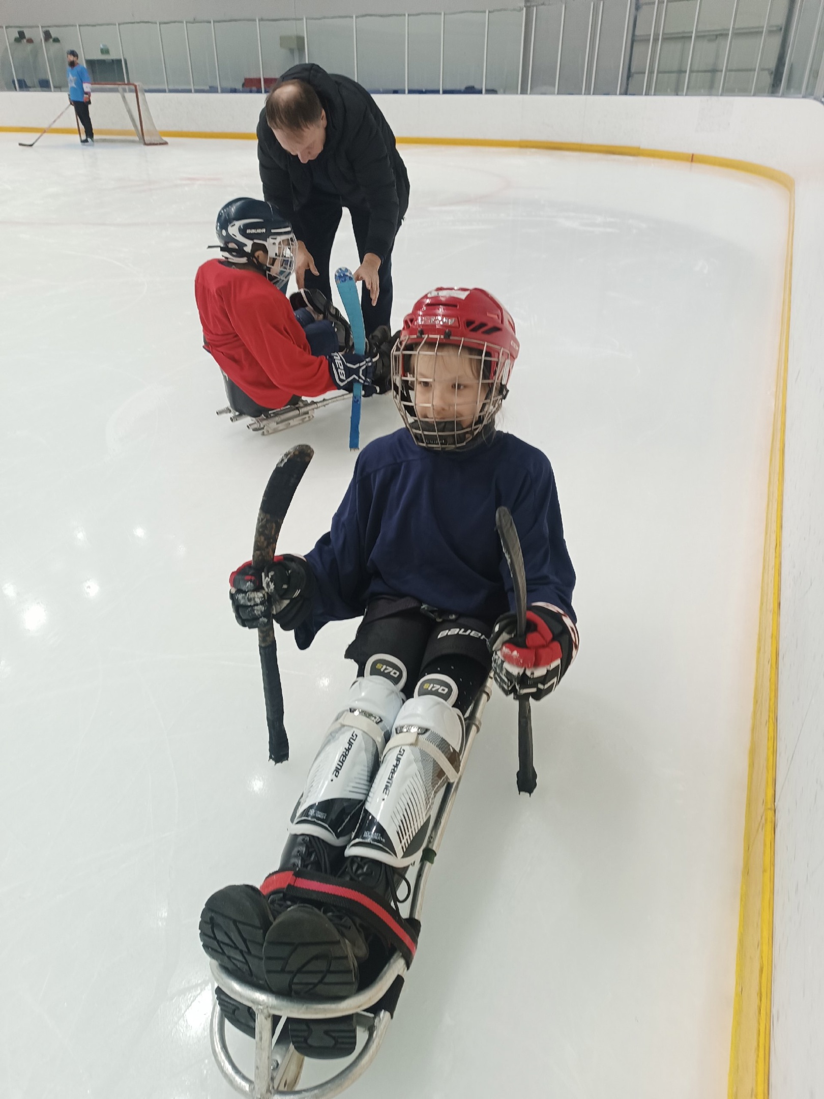 Первая тренировка. Подобрали девчонкам экипировку/сани.