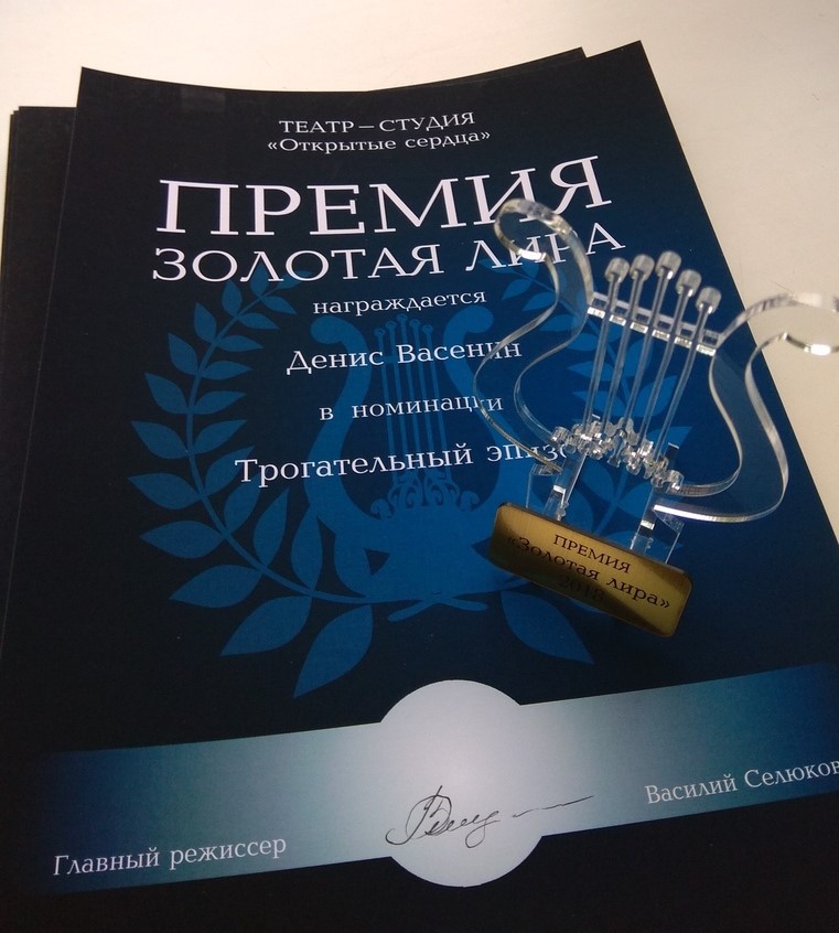 С этого года главным режиссером нашей театр-студии Василием Валерьевичем Селюковым было принято решение проводить подведение итогов ЦЕРЕМОНИЕЙ награждения премией "Золотая лира". Премия является внутристудийным поощрением за творческий вклад в театральное искусство.Наша премия уникальна, а уникальность её в том, что все номинации не повторяются. Каждая номинация подчёркивает личные достижения артиста и членов команды в создании художественного образа спектакля, каждого актера в определенной номинации, а также их родителей, и всех всех, кто принимал участие в создании наших театральных спектаклей. Только представьте: номинации «Трогательный эпизод без слов», номинация «Первые шаги к большим ролям», номинация «Бесподобное исполнение задач режиссёра», номинация «Глубокая трогательность и сердечность», номинация «Чувственная органичность в любой роли» и др.