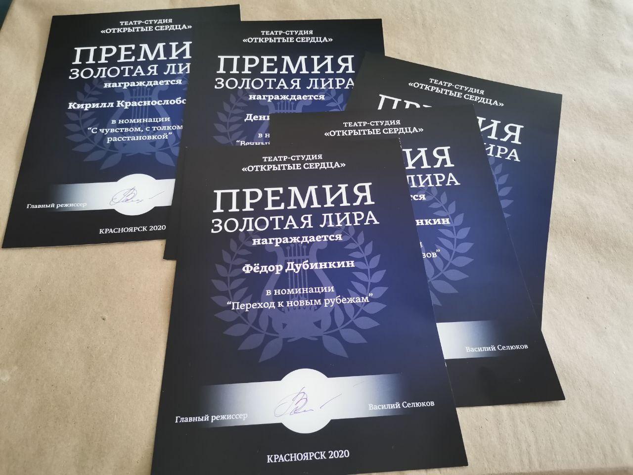 Дима Розинкин: Сегодня, в прекрасный летний денёк, прошла церемония, без которой мы - коллектив театра студии - не можем представить полноценную театральную жизнь. Это церемония вручения премии "Золотая лира" - подведение итогов прошедшего сезона (2019 - 2020). В первый (надеюсь, что в последний раз) она у нас прошла онлайн.