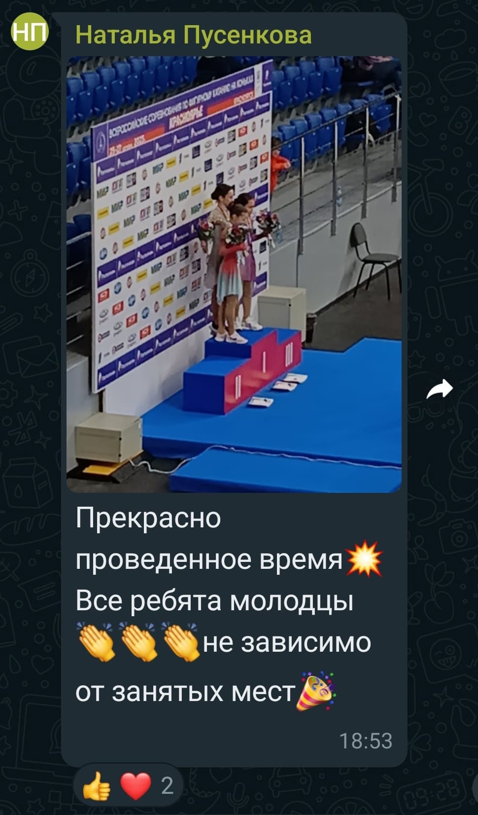 Мы вчера были на соревнованиях фото нет только видео. Спасибо большое что сказали нам. Первый раз были на соревнованиях очень понравилось.
